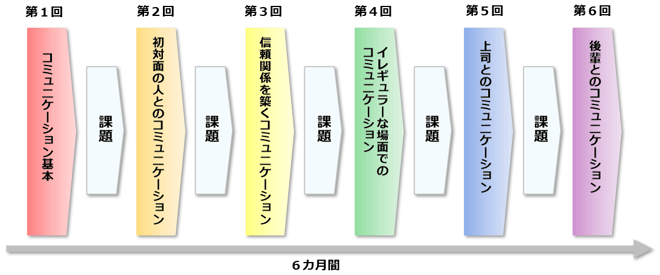 この研修では、場面ごとのコミュニケーションの取り方や、相手に応じた関わり方について、6カ月間かけて学んでいただきます。
