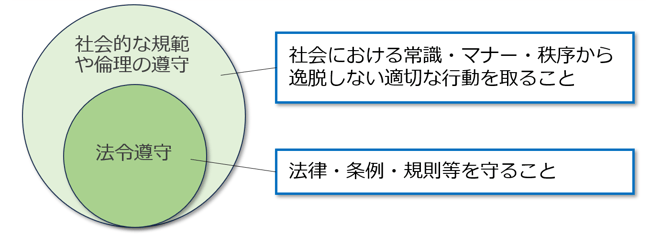 コンプラインスとは狭義では「 法令・条令・規則等を守ること」ですが、広義では「社会における常識・マナー・秩序から逸脱しない適切な行動を取ること」とされています。研修の冒頭では、広い意味でのコンプライアンスが企業に求められていること、またその理由を再認識していただきます。